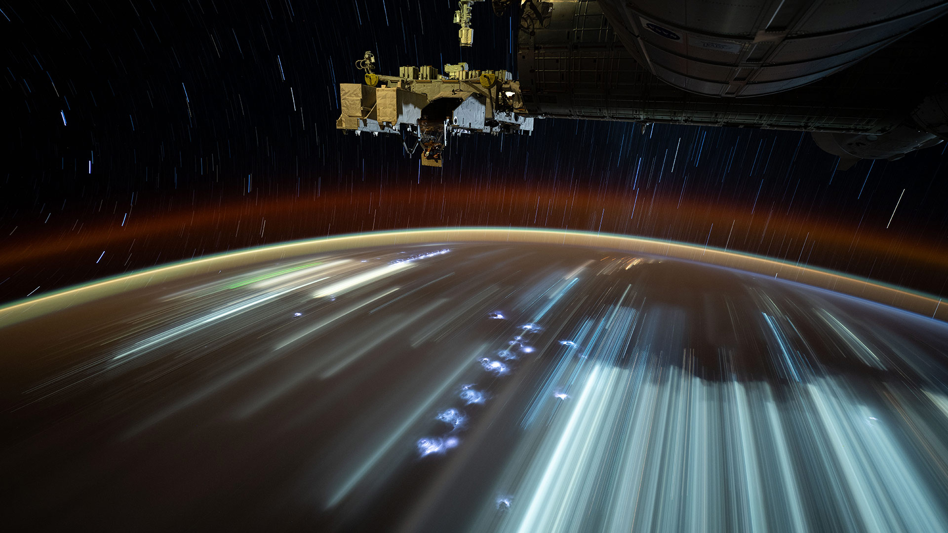 City lights streak below, taken from the International Space Station (© NASA)