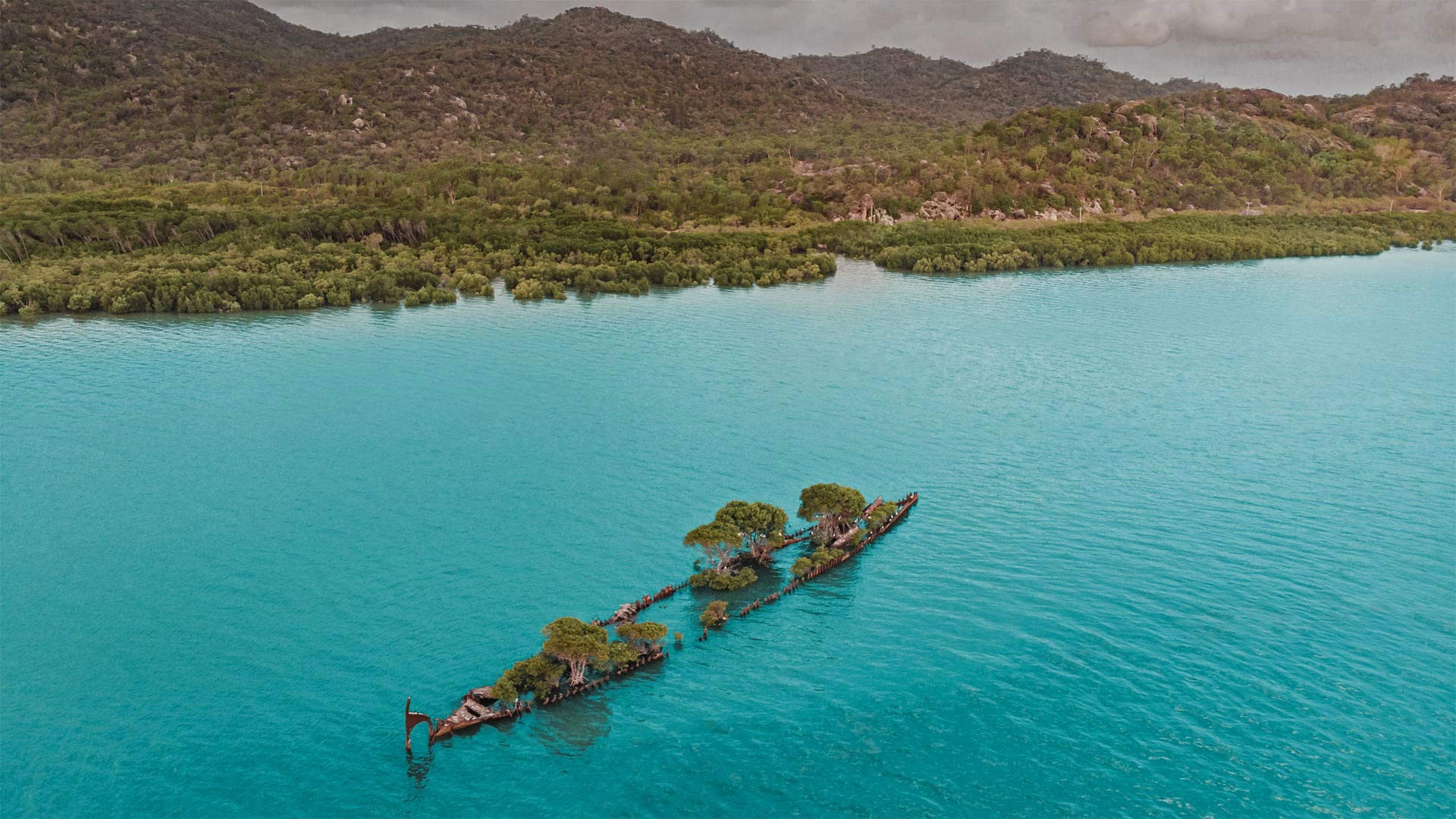 Aerial view of the City of Adelaide shipwreck with trees growing on it, Magnetic Island, Queensland, 澳大利亚 (© Amazing Aerial Agency/Offset by Shutterstock)