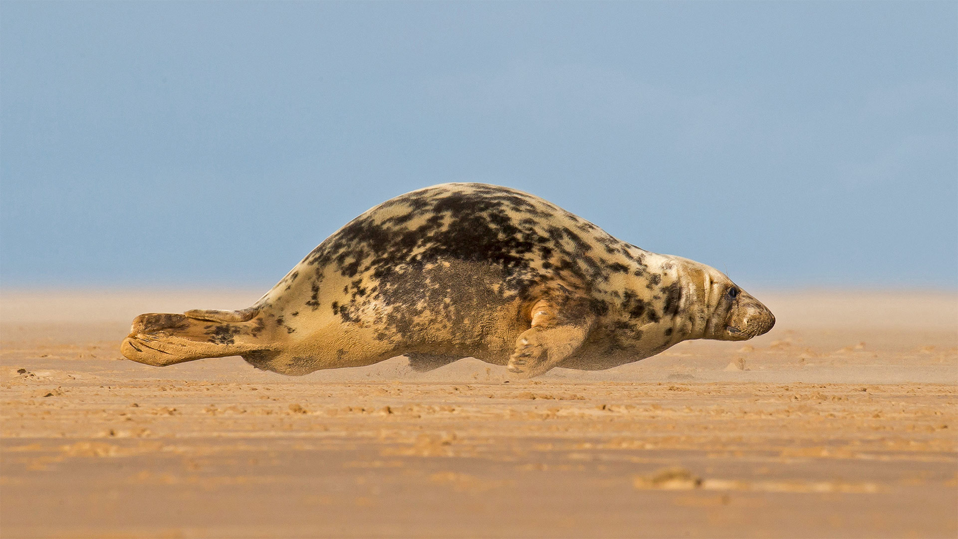 Grey seal hitching itself over the beach at Donna Nook